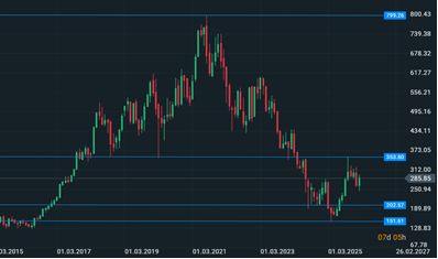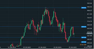 Il re delle capitalizzazioni del lusso si trova sicuramente in difficoltà dal punto di vista dei numeri. Il fatturato è in calo dagli 86,15 miliardi di euro del 2023 fino ad arrivare agli 80,81 miliardi di euro del 2025, un calo significativo dovuto principalmente alla congiuntura globale del settore che tende a sottoperformare da tempo. Dai massimi visti nel 2023 intorno ai 904,5 euro per azione, il titolo è scivolato fino ai 436,6 euro per azione di giugno 2025, perdendo circa un -50%. Da inizio 2026 il titolo perde circa un -13%, raggiungendo picchi minimi del -20% in area 512 euro. La situazione tecnica è ancora compromessa al ribasso dal trend di lungo periodo che sembra non cambiare, continui i test dei minimi e la volatilità rimane ancora relativamente elevata. Le vendite intorno ai 645 euro tra novembre 2025 e gennaio 2026 pesano e danno forza al trend ribassista in atto. Per il momento la dinamica rimane tale seppur l’area tra i 450 e i 510 euro per azione sembra essere una forte zona di supporto dal quale il titolo, qualora dovesse testarla, potrebbe tentare di ripartire al rialzo, a condizione che il mercato azionario globale sia pronto per ulteriori gambe rialziste.