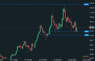 Molto bene Brunello Cucinelli con dei fondamentali che lasciano poco spazio a interpretazione. L’azienda presenta un fatturato in crescita costante dai 712,18 milioni del 2021 agli attuali 1,4 miliardi di euro, praticamente un raddoppio del fatturato in 5 anni. A livello tecnico però vediamo che il titolo ha perso circa un -40% dai massimi visti nel febbraio 2025 in area 133,20 euro per azione, arrivando a toccare un minimo in area 77,60 euro per azione tra settembre 2025 e il mese di gennaio 2026. La situazione tecnica, seppur ribassista, risulta diversa da LVMH e Kering in quanto i prezzi nel lungo termine presentano comunque una dinamica rialzista; ma in questo momento il titolo sta soffrendo il comparto. Una serie di minimi del 2023 in area 73 euro per azione forma un’ottima zona di supporto nel lungo periodo qualora il titolo dovesse proseguire il ribasso. In ogni caso i fondamentali risultano essere solidi anche se il rapporto prezzo/utili risulta leggermente elevato a 43.